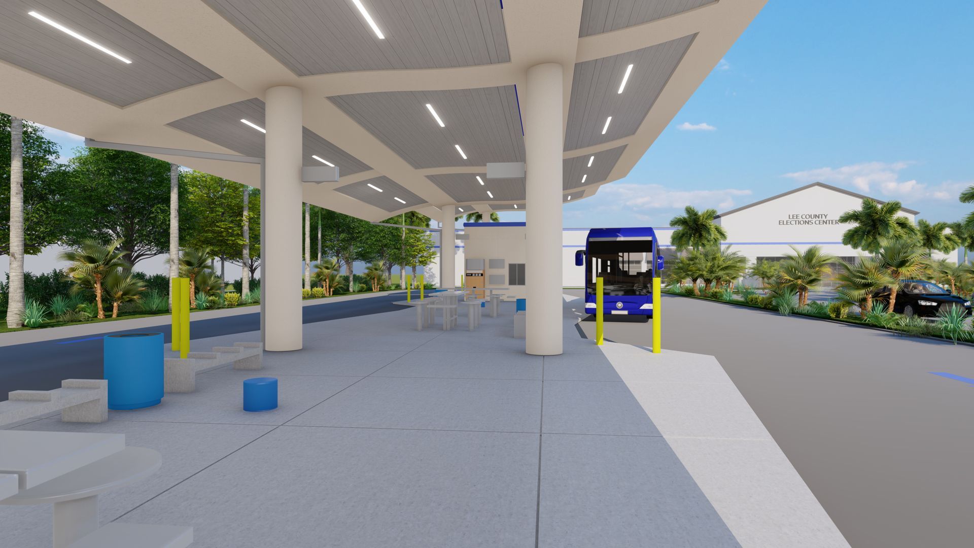 RG Architects, P.A. designed for the Lee County Government, the new Transfer/Multi-Modal Park & Ride. Seven canopied bus bays, a covered waiting area, public restrooms and technology driven amenities were included. The site also features proportionate parking and space for bicycle storage, connections for pedestrians and access for those with limited mobility.