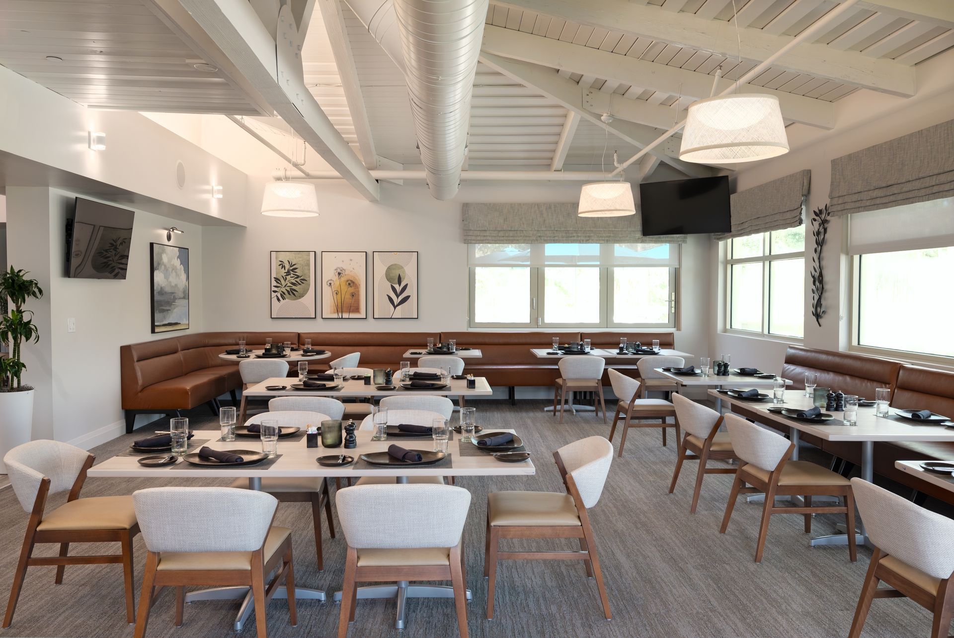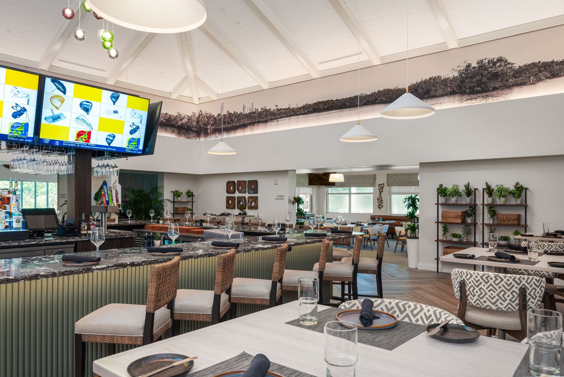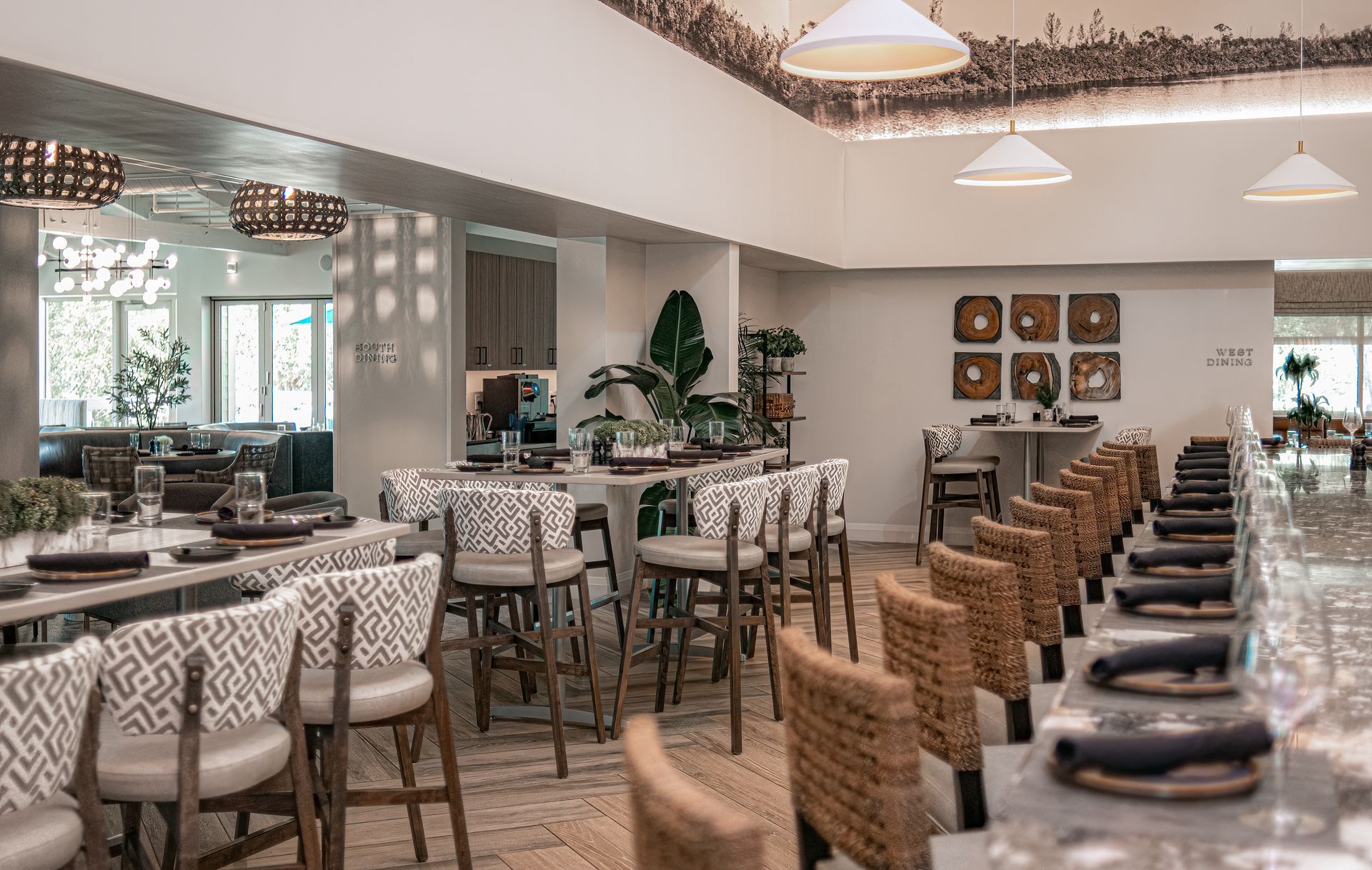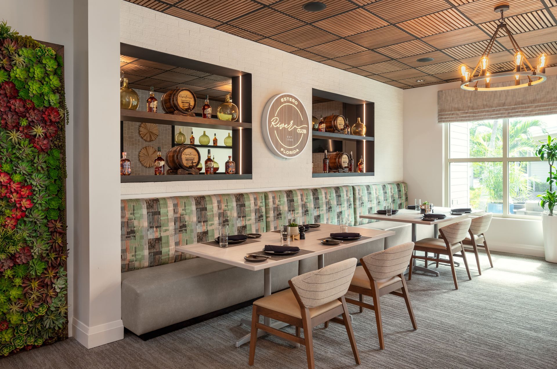 The interior renovations take advantage of the open floorplan by setting in place a new social hub with bar and dining areas complimentary to the lifestyle of the residents. Every room was reimagined to transport people while still radiating the casual vibes of the River Club.