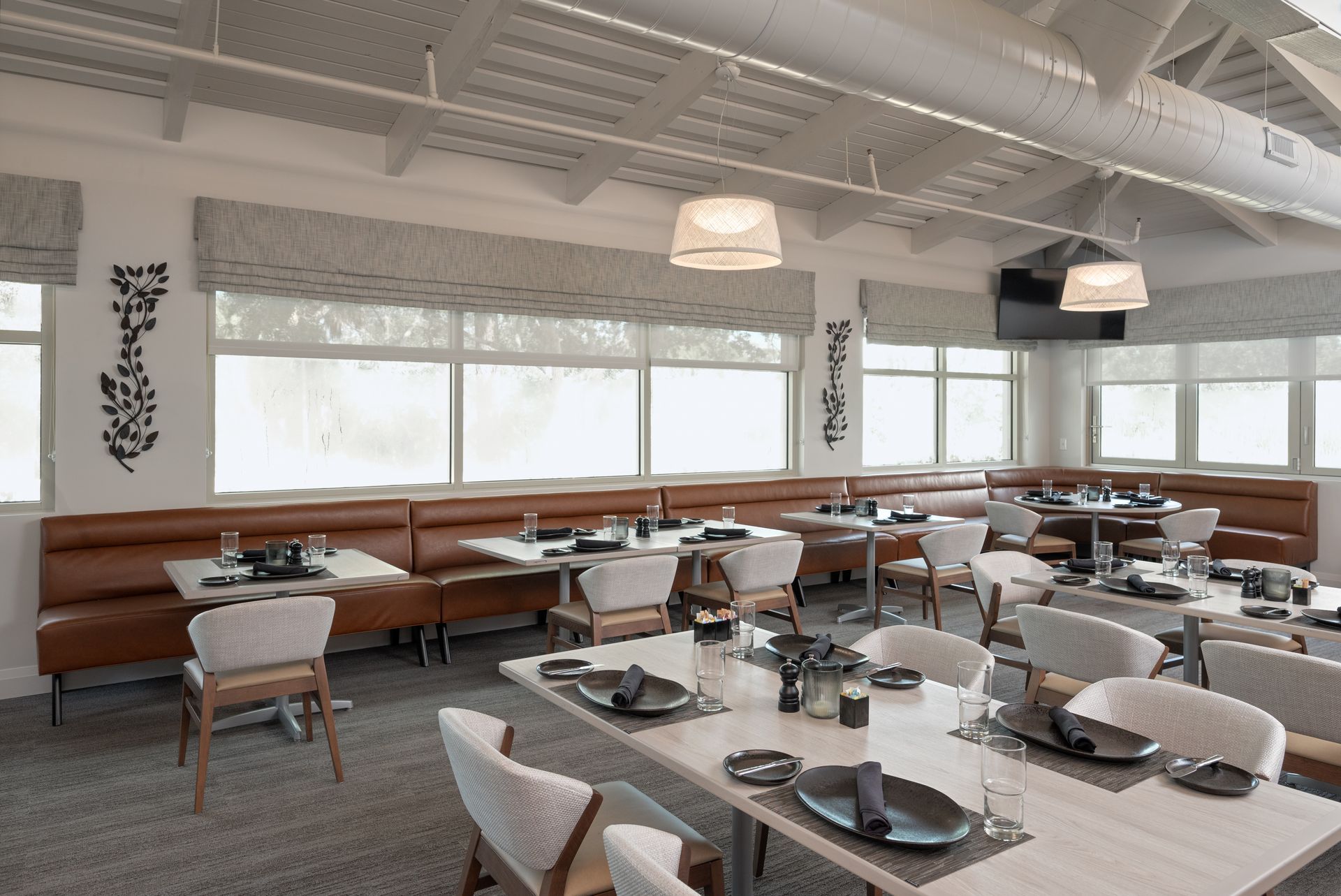 A new outdoor dining space is hosted under a steel structure that respects the existing building but stands out as a new architectural landmark of Pelican Sound.